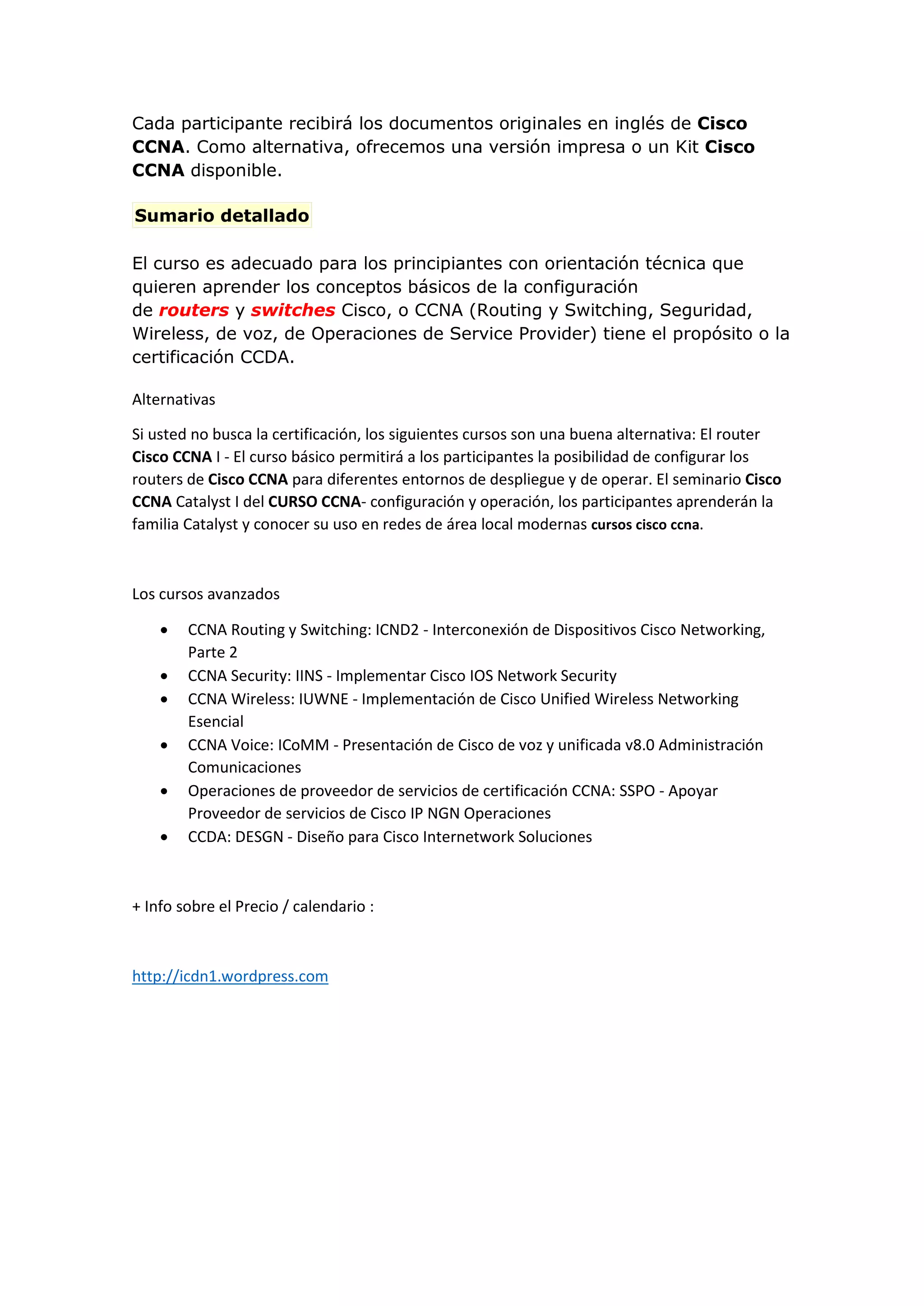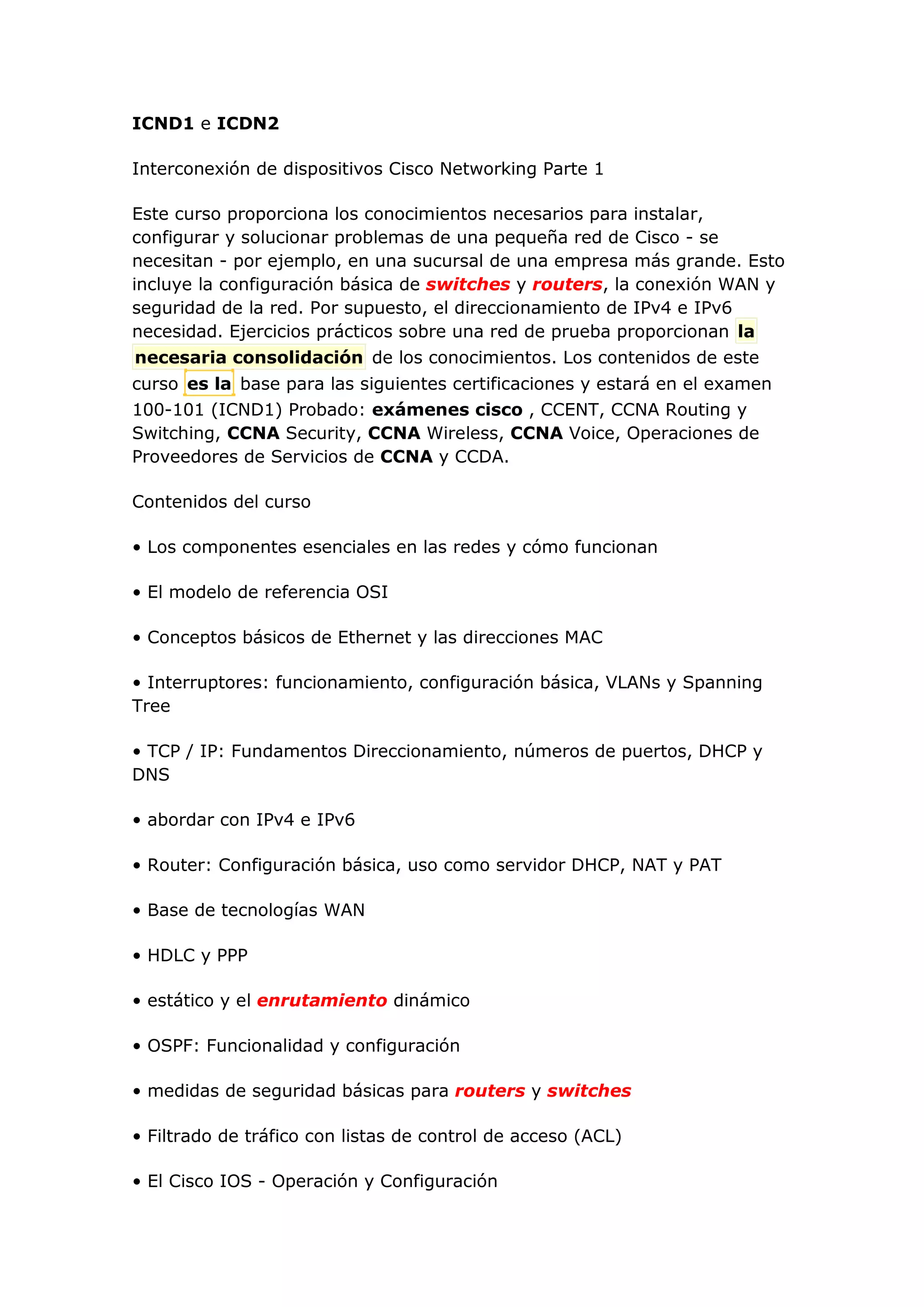 Este curso proporciona los conocimientos necesarios para configurar y solucionar problemas en pequeñas redes de Cisco, incluyendo la configuración básica de switches y routers, conectividad WAN, direccionamiento IPv4 e IPv6, y medidas de seguridad. Los contenidos del curso forman la base para varias certificaciones de Cisco como CCENT, CCNA Routing y Switching y CCNA Security. El curso incluye ejercicios prácticos en una red de prueba para consolidar los conocimientos.