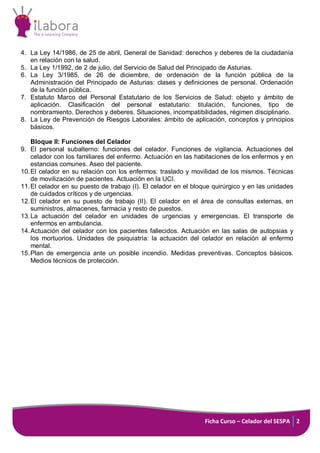 El documento presenta la ficha técnica de un curso para prepararse como celador del Servicio de Salud del Principado de Asturias (SESPA). El curso dura 6 meses y se imparte en modalidad online. Los contenidos se dividen en dos bloques: legislación y funciones del celador. El objetivo es proporcionar una preparación integral del posible temario para las 302 plazas de celador pendientes de convocatoria en el SESPA.
