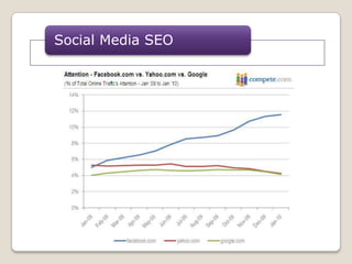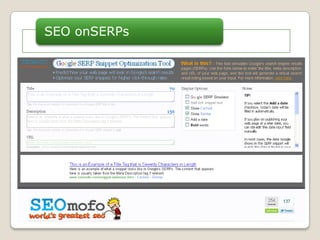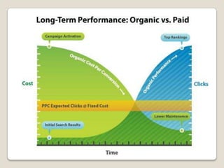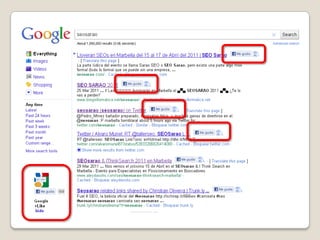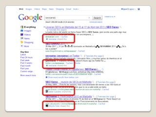 El documento presenta una charla de Miguel López sobre SEO y su relación con PPC y marketing en redes sociales. Se discuten conceptos clave, como el 'triángulo de oro' de las SERPs y tareas esenciales para optimización en buscadores. Además, se mencionan objetivos de proyecto y ejemplos de metas de SEO.