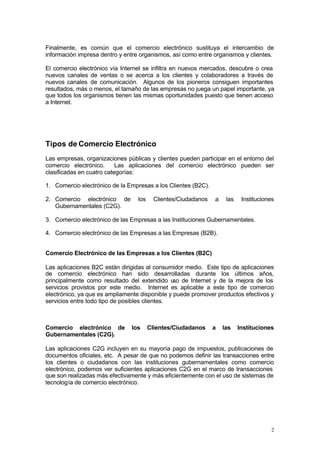 Este documento presenta una introducción al comercio electrónico. Explica los tipos de comercio electrónico como B2C, C2G, B2G y B2B. También describe los modelos básicos como tiendas electrónicas, subastas electrónicas y centros comerciales electrónicos. Finalmente, destaca las ventajas como la disponibilidad las 24 horas y los costos más bajos, y las desventajas como problemas de seguridad y acceso limitado a Internet.