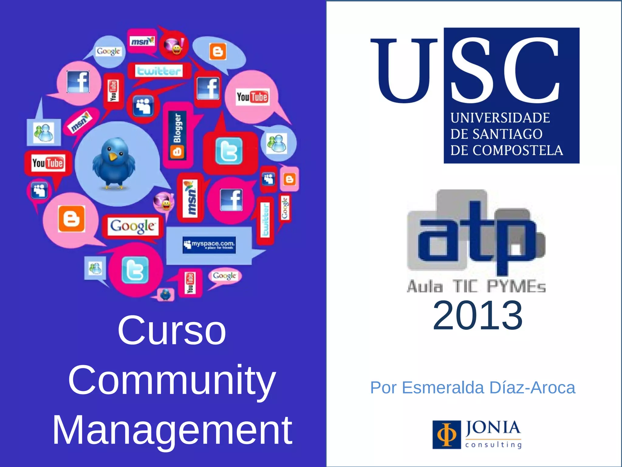 El curso de Community Management, impartido por la Dra. Esmeralda Díaz-Aroca en la Universidad de Santiago de Compostela, ofrece 50 horas de formación (24 horas presenciales y 26 online) sobre marketing digital y gestión de redes sociales. Los participantes aprenderán a desarrollar estrategias de social media y a optimizar la reputación online de las marcas, con un enfoque práctico y casos reales. Las inscripciones están abiertas hasta el 31 de marzo de 2013, con dos modalidades de pago disponibles.