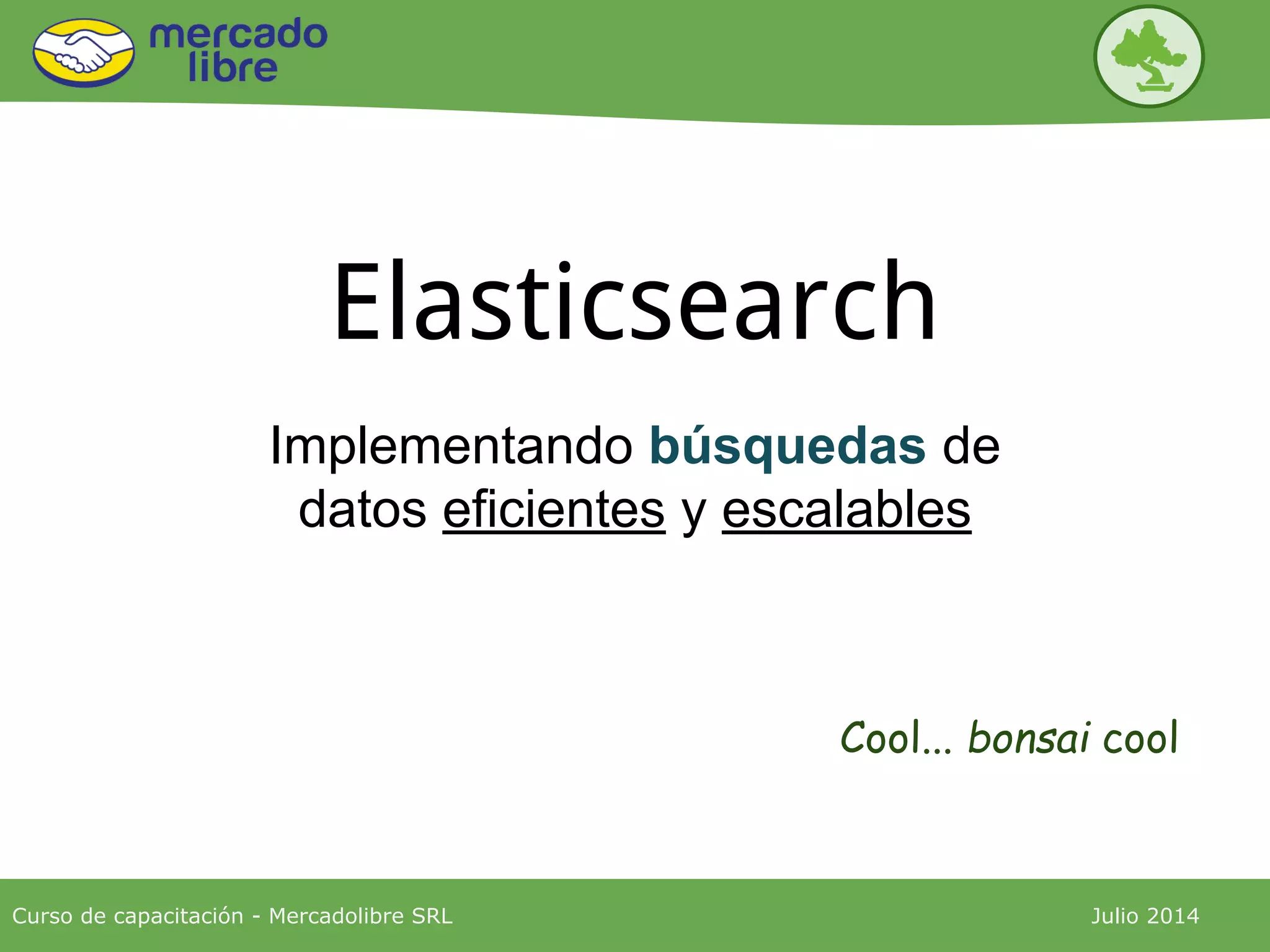Este documento presenta una capacitación sobre Elasticsearch. Explica que Elasticsearch es un motor de búsqueda orientado a documentos basado en Apache Lucene. La capacitación cubre conceptos como shards, réplicas, indexado y recuperación de datos, y ejemplos prácticos de consultas HTTP a un cluster Elasticsearch. El objetivo es introducir las características centrales de Elasticsearch y cómo usarlas para implementar búsquedas de datos eficientes y escalables.