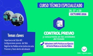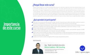 El documento detalla un curso de control moderno en la gestión pública, enfatizando la importancia del control previo, concurrente y posterior para mejorar la eficiencia y transparencia en el uso de recursos públicos. Incluye contenidos relacionados con normas de presupuesto, contabilidad y tesorería, así como procedimientos técnicos necesarios para una gestión pública eficaz. Se menciona que el curso es práctico y ofrece certificación, abordando las necesidades formativas de los profesionales en el ámbito gubernamental.