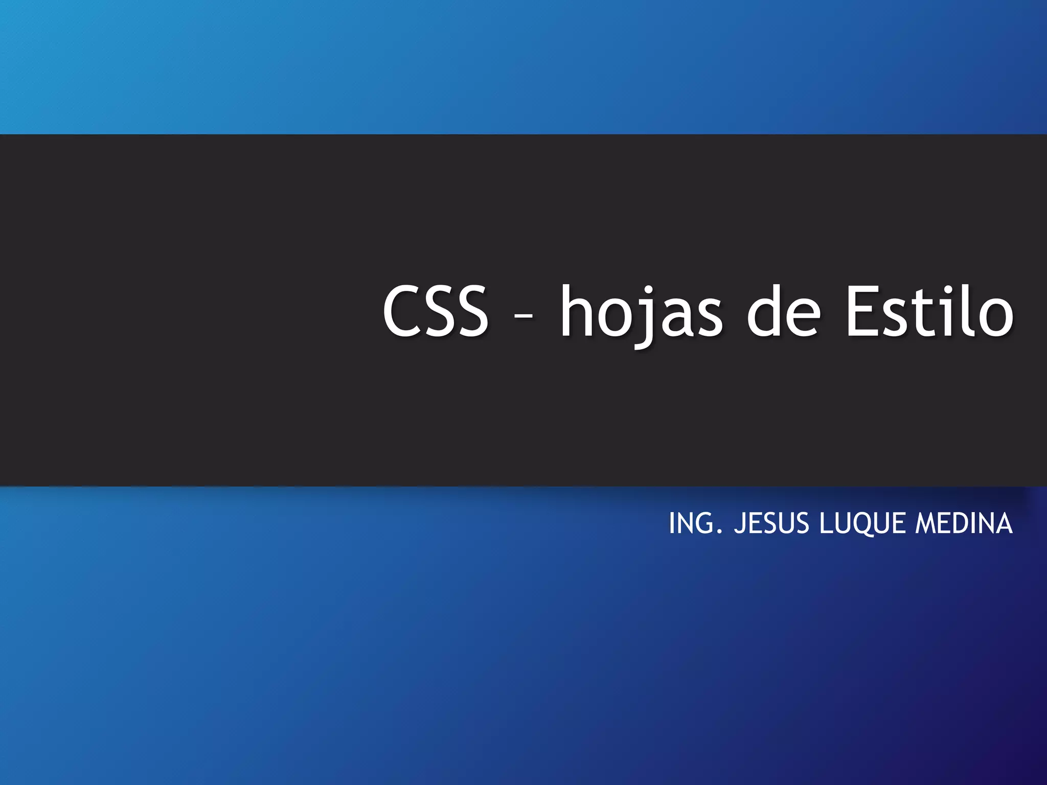 Este documento introduce los conceptos básicos de CSS (Hoja de Estilos en Cascada). Explica que CSS permite separar la presentación del contenido en las páginas web y controlar el estilo y diseño de los elementos. Describe los diferentes selectores, propiedades y valores que se pueden usar en las reglas CSS, así como conceptos como el modelo de cajas, unidades de medida, colores y tipos de fondo, bordes, márgenes y rellenos. El objetivo final es comprender cómo utilizar CSS para dar formato a la presentación de páginas web.