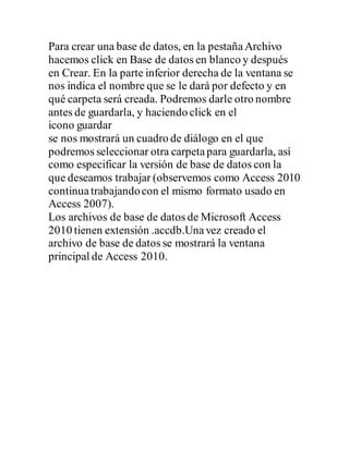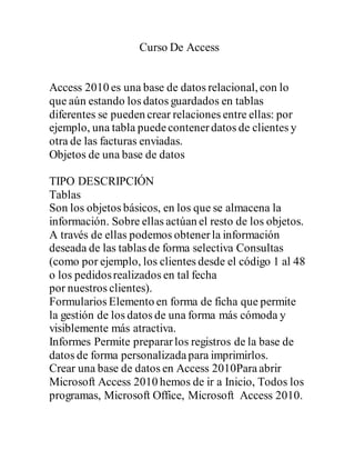 Access 2010 es un programa de base de datos relacional que permite almacenar datos en tablas y crear relaciones entre ellas. Contiene objetos como tablas, consultas, formularios e informes para organizar y acceder a la información de manera selectiva. Para crear una base de datos nueva en Access 2010, se abre el programa, se selecciona "Base de datos en blanco" y "Crear", y se le da un nombre y ubicación al archivo con extensión .accdb.