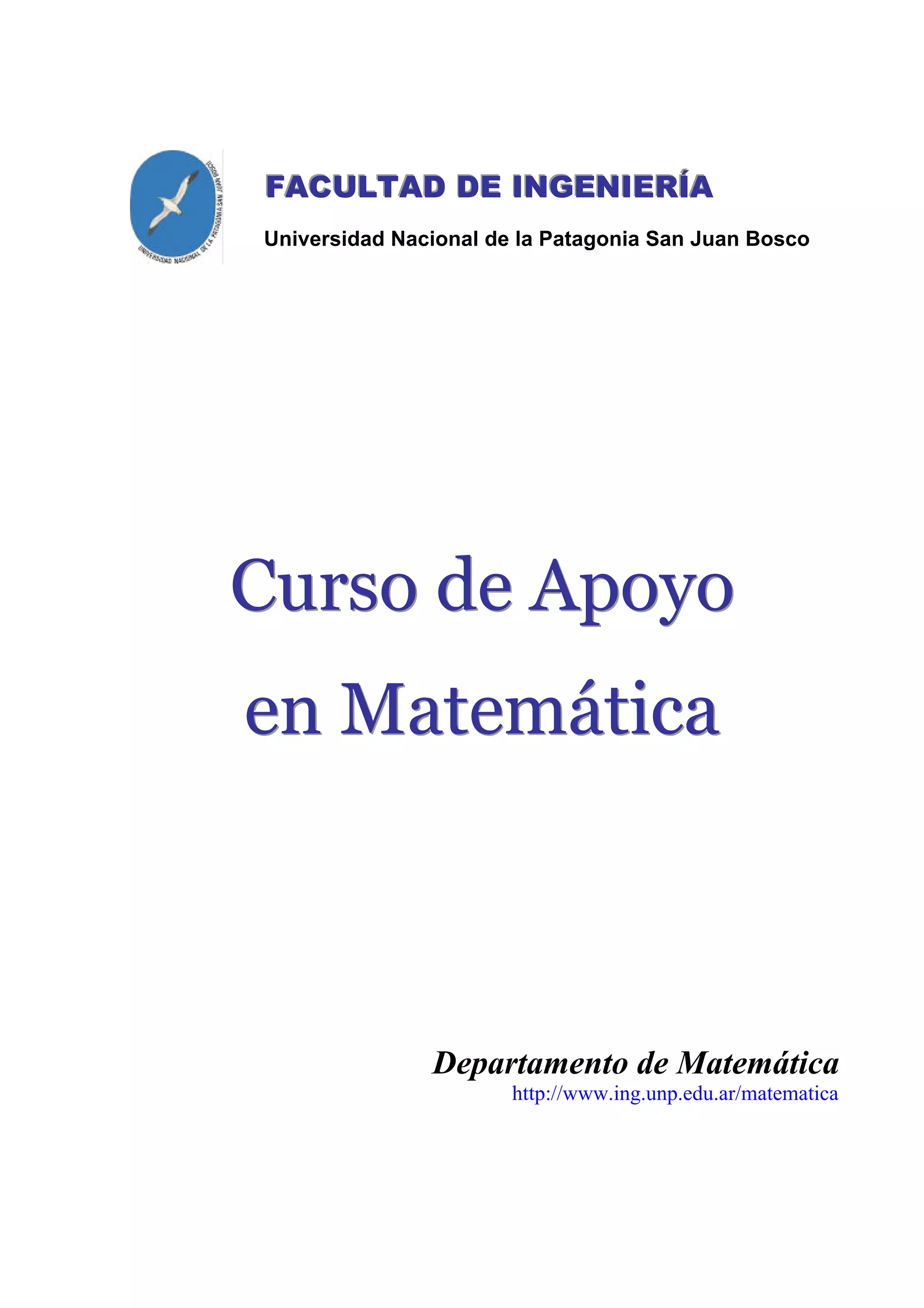 Este documento es un material de apoyo dirigido a los aspirantes de la facultad de ingeniería de la Universidad Nacional de la Patagonia San Juan Bosco, contiene información sobre las temáticas que se evalúan en el examen de ingreso y una variedad de ejemplos prácticos. Se abordan conceptos fundamentales de matemáticas, incluyendo números naturales, enteros, funciones, y distintos tipos de ecuaciones, como cuadráticas y polinómicas. El objetivo es desarrollar habilidades necesarias para el estudio de áreas básicas en ingeniería e informática.