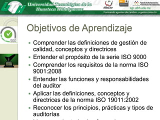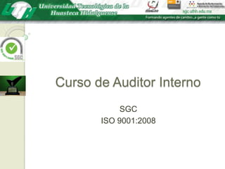 Este documento presenta un curso de auditor interno de sistemas de gestión de calidad ISO 9001:2008. Los objetivos del curso son comprender los conceptos y requisitos de la norma ISO 9001, entender las funciones del auditor y aplicar los principios y prácticas de auditoría. El curso consta de 10 sesiones presenciales con exámenes y casos prácticos. Los instructores cubrirán temas como la norma ISO 9001, documentación del sistema de calidad, introducción a la auditoría y desarrollo de auditorías.