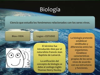 La biología es la ciencia que estudia los seres vivos. Establece similitudes y diferencias entre organismos, y características propias de los seres vivos de acuerdo a sus estructuras y funciones. Se divide en ramas como la botánica, zoología, bacteriología, que a su vez se subdividen en campos como la anatomía, fisiología, genética y ecología.