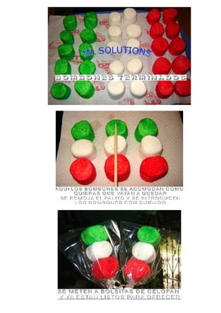 Este documento proporciona instrucciones para hacer diferentes tipos de dulces, incluyendo paletas de bombón cubiertas de chocolate, fondue de bombón, y placas de bombón con miel. Explica los materiales necesarios y los pasos a seguir para cada receta, como derretir el chocolate, envolver los bombones, y decorar los dulces finalizados.