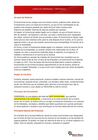 El documento proporciona información sobre el ceremonial y el protocolo a través de la historia. Explica que el ceremonial es una tradición antigua presente en civilizaciones como Egipto y China, donde estaba ligado a la religión y la ética. También describe los orígenes de la palabra "protocolo" y distingue el ceremonial, que establece normas de comportamiento, del protocolo, que se enfoca específicamente en eventos estatales. Por último, resume algunas reglas básicas sobre presentaciones, saludos y redacción de cartas.