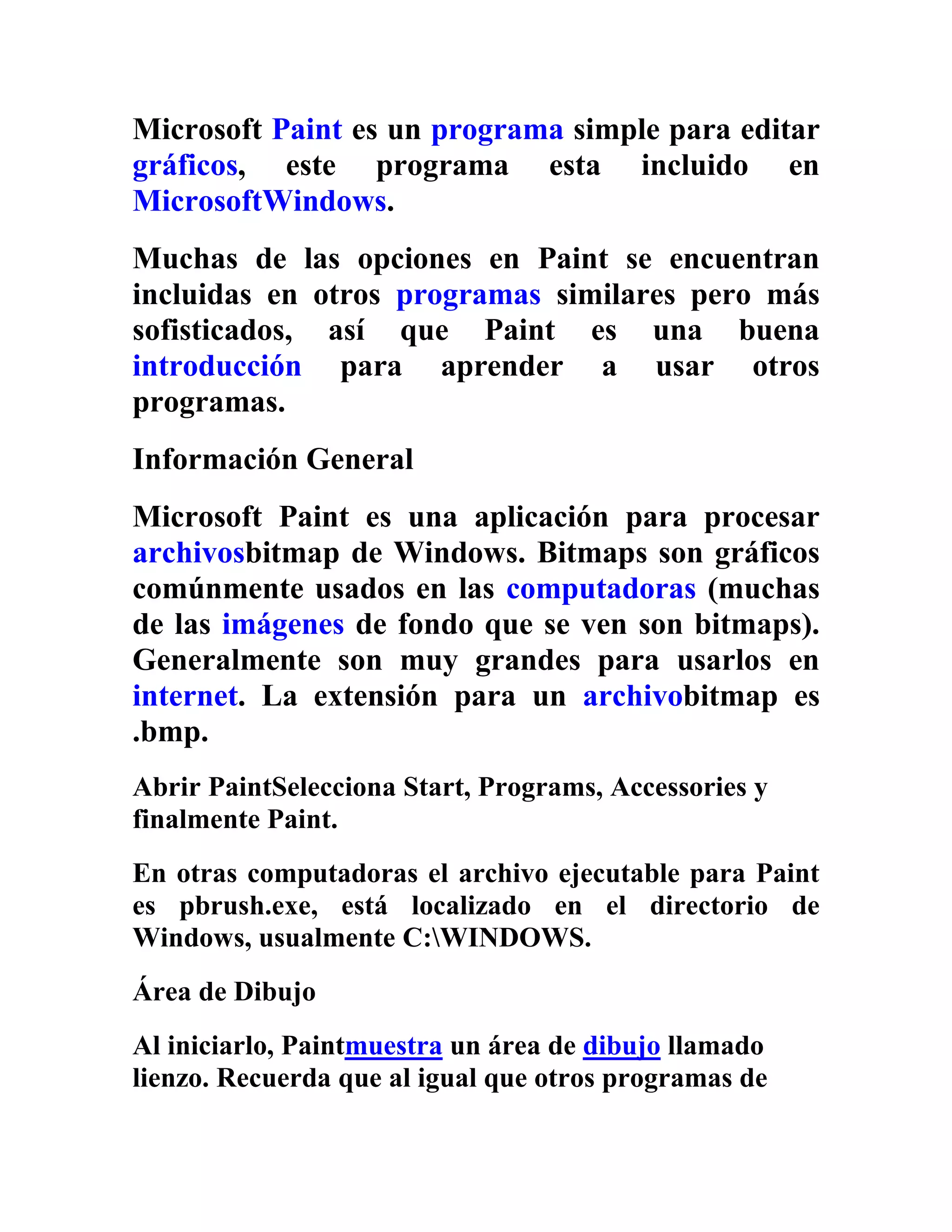 Microsoft Paint es un programa simple incluido en Windows para editar gráficos. Ofrece herramientas básicas como dibujar líneas, formas geométricas y añadir texto. Aunque sus opciones son limitadas, Paint sirve como introducción a programas de edición gráfica más avanzados. El documento luego explica las diferentes herramientas y funciones de Paint para dibujar, colorear, borrar y guardar imágenes.