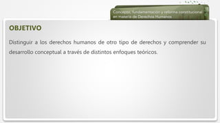 El documento presenta información sobre conceptos y definiciones de derechos humanos, así como sobre las obligaciones del Estado de respetar, garantizar, proteger y promover los derechos humanos de acuerdo con la Constitución mexicana. Explica brevemente los principales enfoques teóricos sobre derechos humanos y las reformas constitucionales en esta materia.