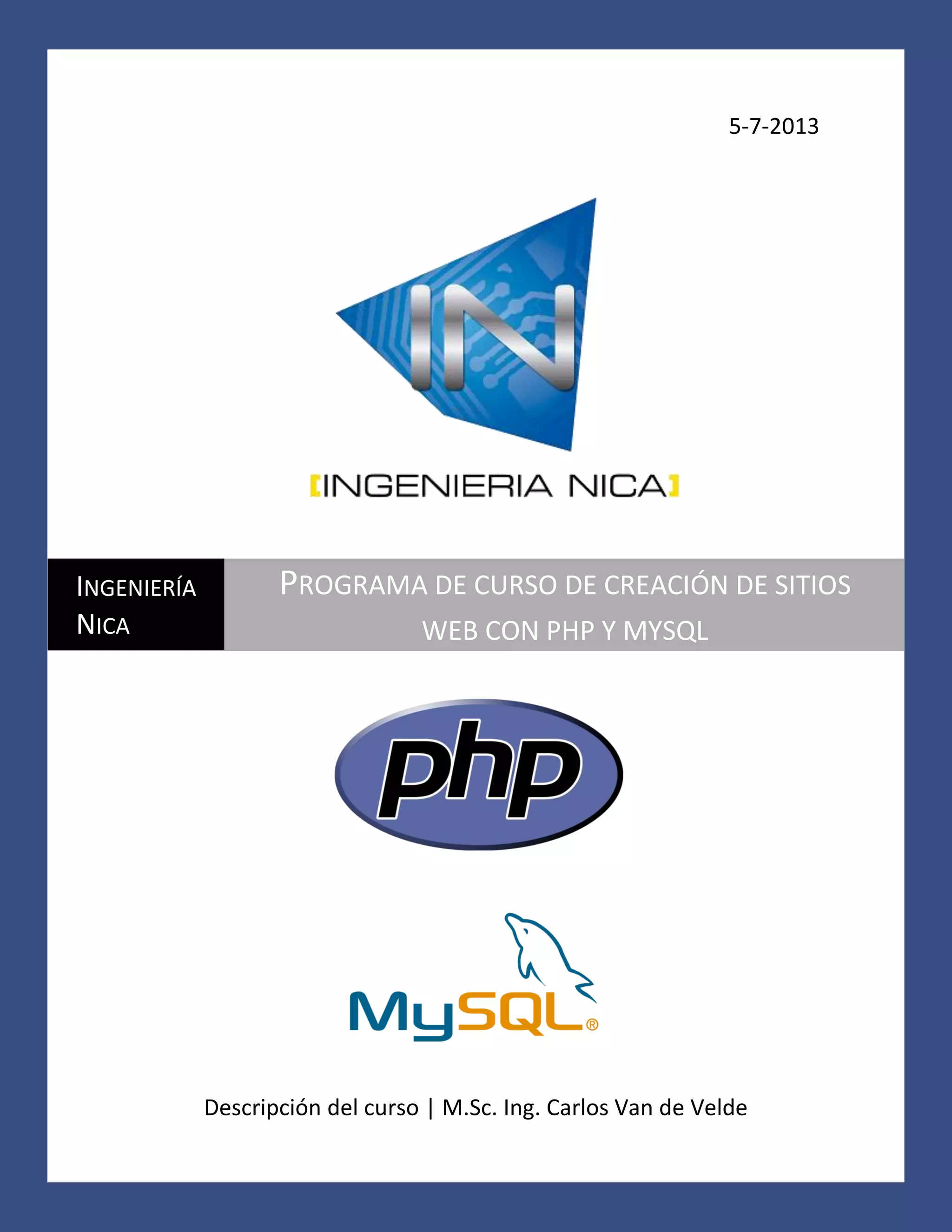 El curso de creación de sitios web con PHP y MySQL proporcionado por Ingeniería Nica tiene como objetivo fortalecer las capacidades profesionales de los estudiantes mediante una metodología cooperativa y flexible. El curso incluye aprendizaje práctico sobre PHP y MySQL, considerando su relevancia en el mercado laboral, y tiene requisitos de inscripción como el conocimiento previo de HTML, JavaScript y CSS, así como un costo total de $60. Los módulos abarcan desde introducción a PHP, creación de formularios, hasta seguridad en aplicaciones web, con una duración de hasta 2 meses.