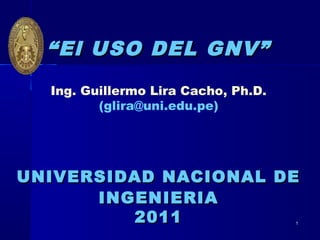 Este documento trata sobre el uso del gas natural vehicular (GNV) en el Perú. Brevemente describe que el GNV es una alternativa al petróleo debido a sus mayores reservas y menores precios. También ofrece ventajas ambientales al emitir menos contaminantes que la gasolina. Actualmente hay 117,500 vehículos a GNV en el Perú, aunque su uso se ve limitado por la escasez de gasocentros.