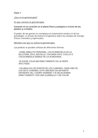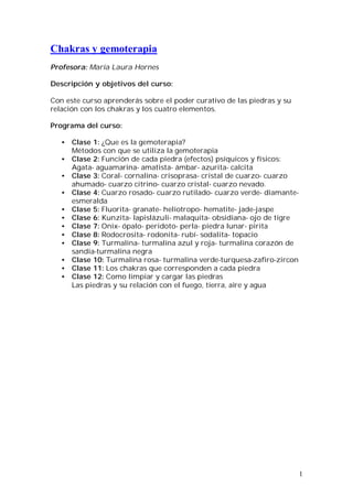 Este curso enseña sobre la gemoterapia, que utiliza piedras y cristales para curar el cuerpo y la mente. El programa incluye 11 clases sobre los efectos físicos y psíquicos de diferentes piedras como la amatista, el cuarzo y la turmalina, y su relación con los siete chakras. También cubre cómo limpiar y cargar las piedras para maximizar sus beneficios curativos.