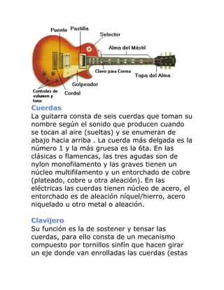 El documento describe las partes principales de las guitarras acústicas y eléctricas, incluyendo el mástil, diapasón, trastes, cuerpo de resonancia, puente, pastillas (en guitarras eléctricas) y clavijas. También explica cómo sostener correctamente cada tipo de guitarra y la posición de las manos y dedos para tocarlas.