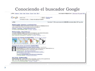 Este documento ofrece una guía sobre las herramientas de búsqueda de Google para periodistas. Explica características como el título, dirección web y snippet que aparecen en los resultados de búsqueda, así como funciones útiles como la búsqueda en caché y diferentes filtros de palabras como la exclusión, búsqueda de frases, en sitios específicos o por tipo de archivo. También cubre la búsqueda avanzada la cual permite opciones adicionales de delimitación para investigaciones.