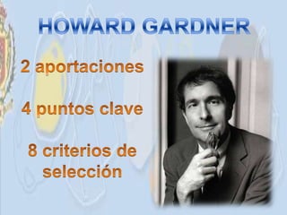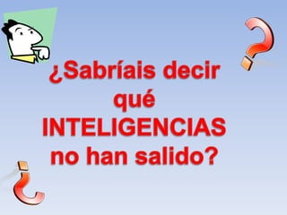 Este documento presenta la Teoría de las Inteligencias Múltiples de Howard Gardner. Según esta teoría, la inteligencia no es un constructo unitario sino que está compuesta por múltiples capacidades independientes como la lingüística, lógico-matemática, espacial, corporal-cinestésica, musical, interpersonal, intrapersonal y naturalista. El documento también discute cómo los docentes pueden aplicar esta teoría en el aula para enseñar de manera más efectiva reconociendo las diferentes inteligencias de los estudiantes.