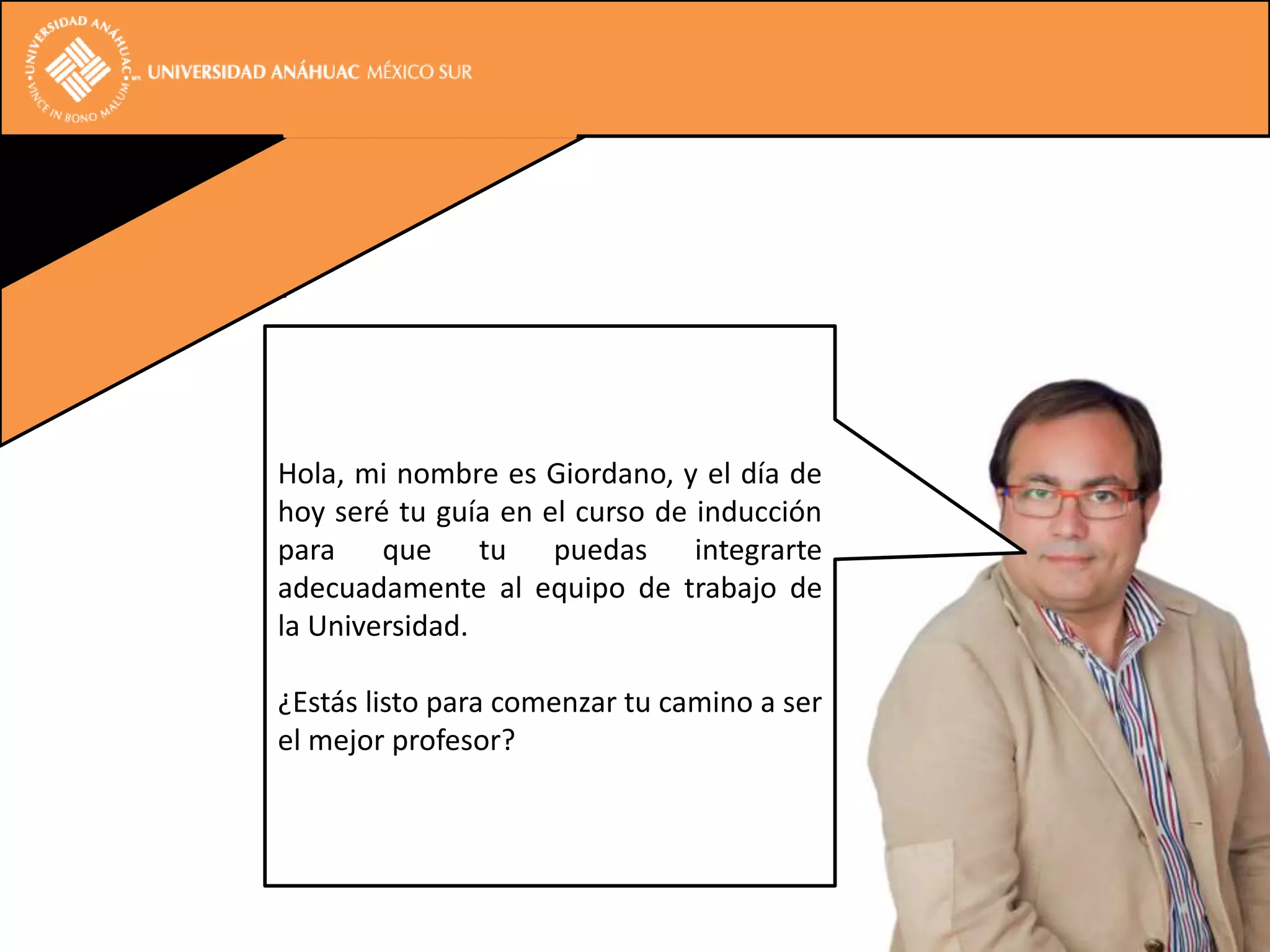 1) El documento presenta la información sobre una inducción para nuevos profesores en la Universidad, incluyendo presentaciones sobre la misión, visión y reglamento de la institución.