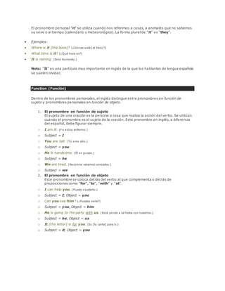 Este documento proporciona información sobre los pronombres personales, posesivos, demostrativos y reflexivos en inglés. Explica las funciones de sujeto y objeto de los pronombres personales y cómo varían los pronombres posesivos y demostrativos según número y distancia. También cubre las reglas gramaticales para el uso de pronombres posesivos y genitivos.