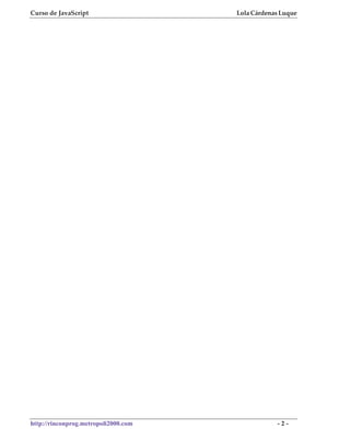 Este documento presenta una versión PDF de un curso de JavaScript existente en la web http://rinconprog.metropoli2000.com. La autora es Lola Cárdenas Luque, quien ofrece este curso especial como regalo por el primer aniversario de su sitio web El Rincón del Programador. El curso incluye nuevos ejemplos y mejoras respecto a la versión original, con el objetivo de ampliar la información y hacer la presentación más agradable.