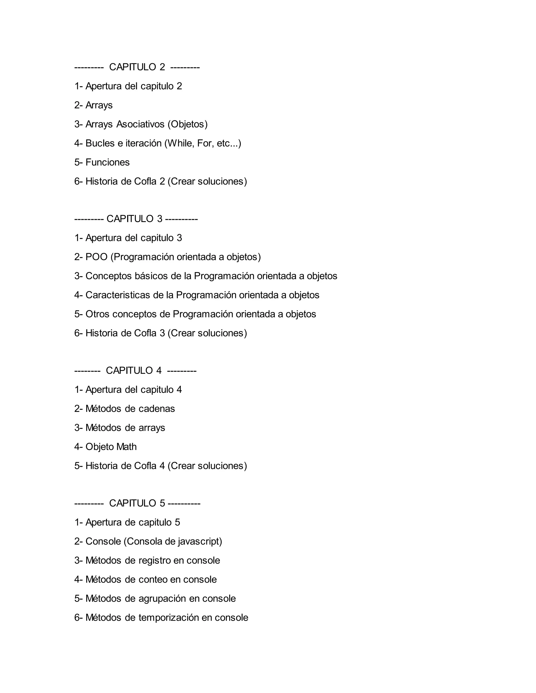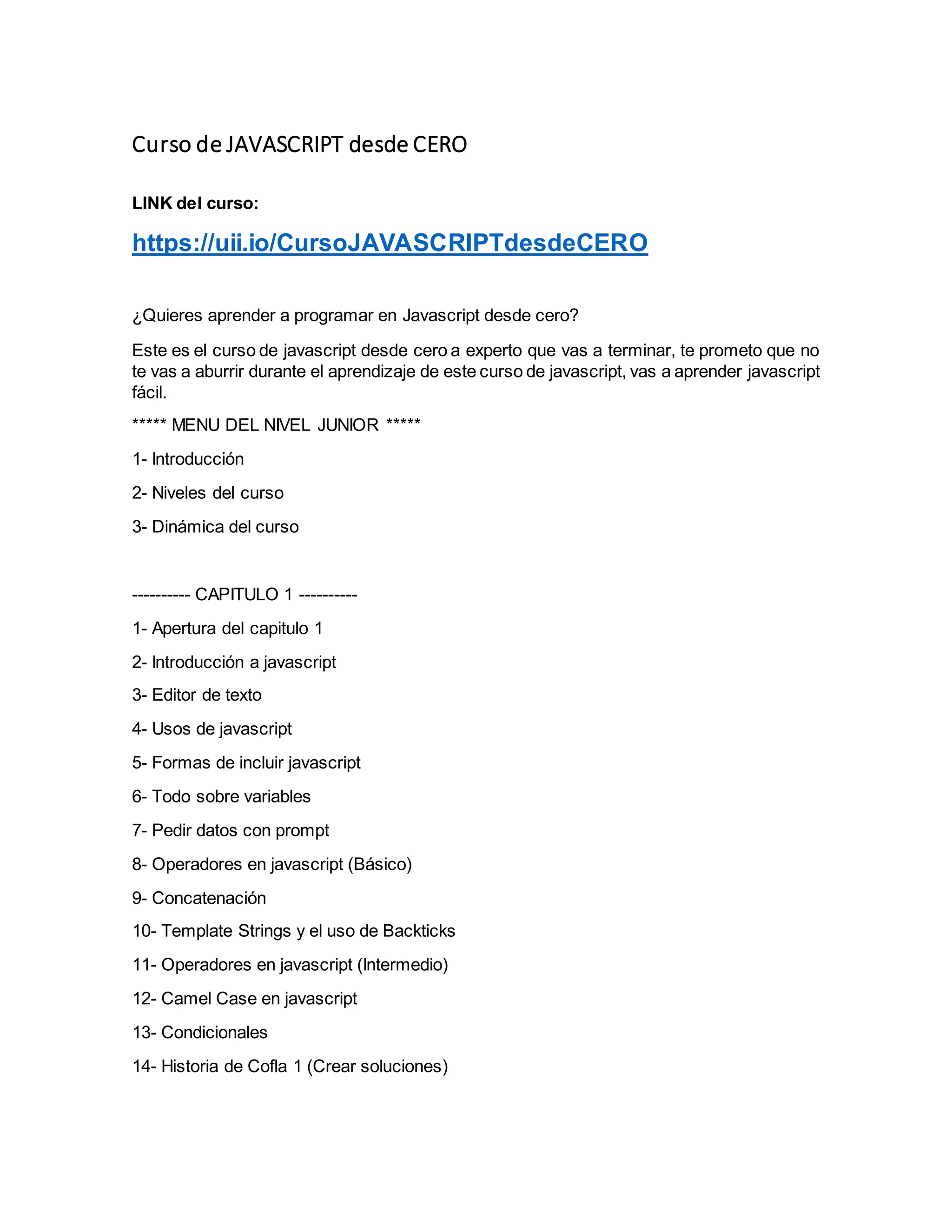 El documento presenta un curso de JavaScript diseñado para principiantes, que abarca desde la introducción al lenguaje hasta conceptos avanzados. Incluye un menú estructurado por niveles y capítulos que tratan temas como variables, arrays, programación orientada a objetos y el Document Object Model (DOM). El curso promete un aprendizaje entretenido y práctico con ejercicios y soluciones a través de historias interactivas.