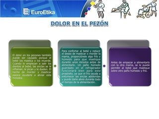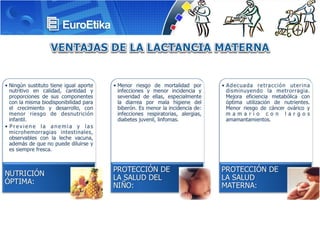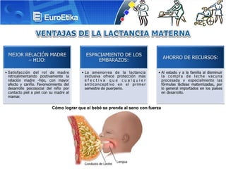 La lactancia materna es la mejor alimentación para recién nacidos y niños menores de un año, debe ser exclusiva en los primeros 6 meses y continuar durante el primer año. La OMS recomienda amamantar hasta los 2 años para reducir morbilidad y mortalidad infantil, brindar nutrición óptima y beneficios para la salud materna. El dolor en los pezones durante la lactancia es común en las primeras semanas y puede deberse a grietas, resequedad de la piel o malas posiciones al amamantar.