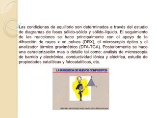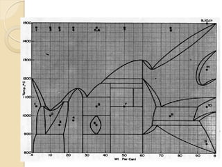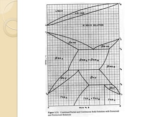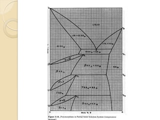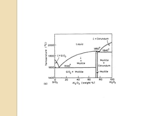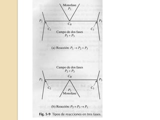El documento describe los diagramas de fases sólido-sólido y sólido-líquido que muestran las condiciones de equilibrio en los materiales. Explica que las fases presentes, el tamaño de grano, las interfaces y la porosidad determinan las propiedades de los materiales cerámicos. También analiza conceptos como soluciones sólidas, puntos eutécticos, y cómo la velocidad de enfriamiento afecta la microestructura en sistemas eutécticos.