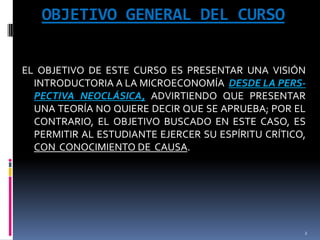Este documento presenta el plan de estudios del curso de Microeconomía I dictado por el profesor Sergio Monsalve en el semestre II de 2012. El curso tiene como objetivo principal presentar los conceptos básicos de la microeconomía neoclásica y analizar el comportamiento de hogares, empresas y mercados bajo diferentes estructuras como la competencia perfecta, monopolio y oligopolio. El curso consta de 13 clases magistrales y talleres semanales que abordan temas como la teoría del consumidor, producción, costos, equilibrio de mercado y fallas