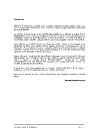 Este documento presenta un resumen del curso completo de teoría de la música desarrollado por Vanesa Cordantonopulos. El curso consta de 10 niveles que cubren temas como la notación musical, escalas, intervalos, acordes, armonía funcional y técnicas avanzadas como el arreglo y la transcripción musical. El objetivo es proporcionar herramientas prácticas para entender, analizar y crear música de una manera enlazada y aplicada.