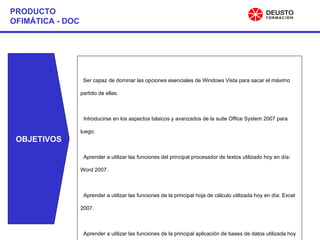 Este documento describe un curso de ofimática que enseña las funciones básicas y avanzadas de Windows Vista, Word 2007, Excel 2007, Access 2007 y PowerPoint 2007. El curso tiene como objetivos que los estudiantes dominen las opciones esenciales de Windows Vista y aprendan a utilizar las principales funciones de cada programa de Office 2007. Incluye 10 unidades didácticas con ejercicios de evaluación y materiales como CD interactivos durante 400 horas aproximadamente.