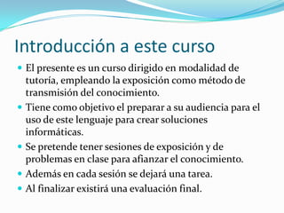 Este documento presenta un curso introductorio sobre PL/SQL. Explica que PL/SQL es un lenguaje estructurado que permite el uso de sentencias SQL y de control como if y bucles. El curso se impartirá mediante exposiciones y problemas en clase para reforzar el conocimiento. Cubrirá temas como las categorías y estructura de PL/SQL así como ejemplos de cómo insertar, actualizar y borrar datos.