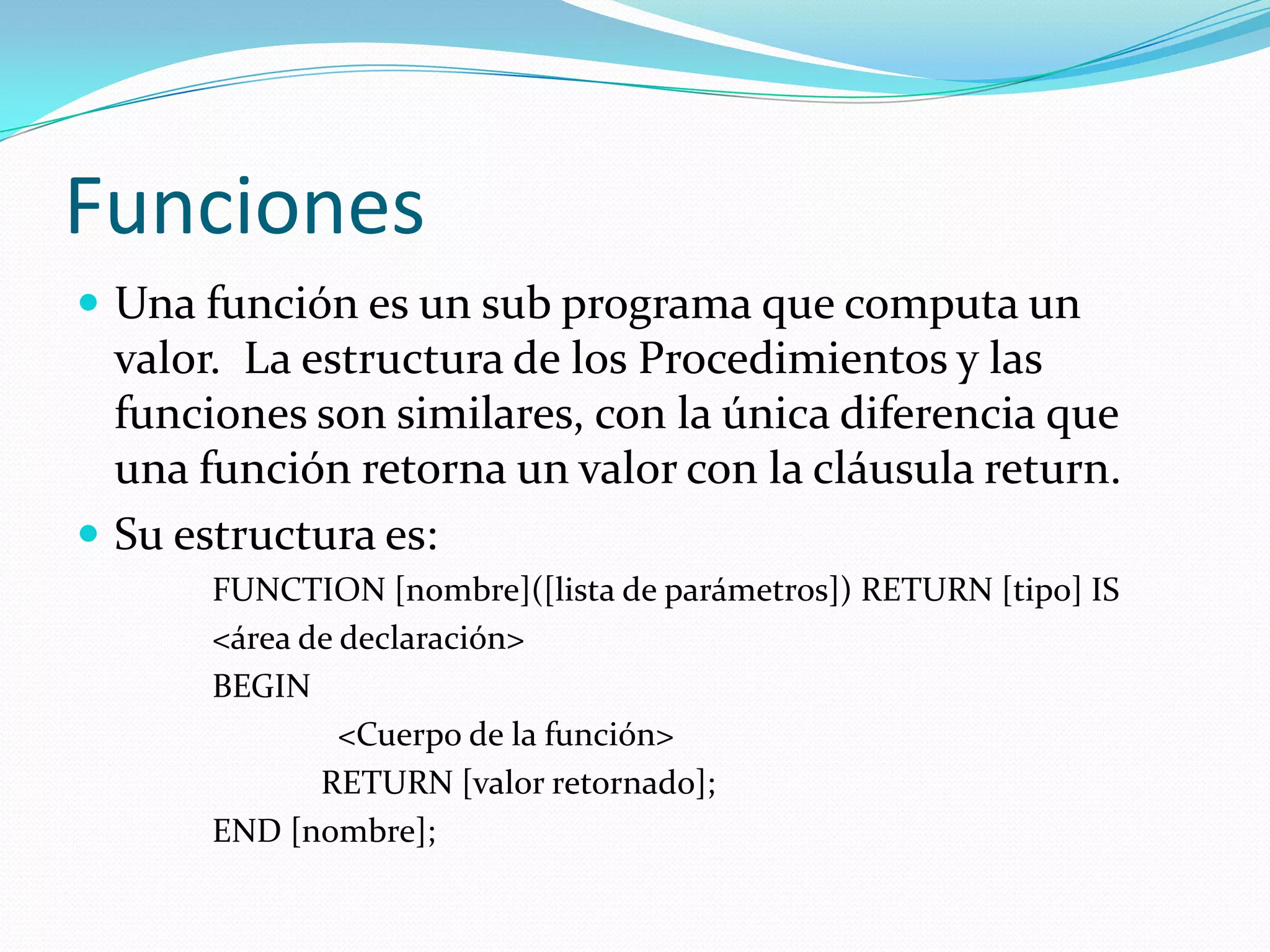 El documento explica las funciones en PL/SQL, su estructura y cómo crearlas. Luego describe dos funciones específicas creadas, "fun_obtiene_pagos_factura" y "fun_obtiene_dias_mora", y muestra cómo usar consultas SQL para llamar a estas funciones. Finalmente, enumera cuatro funciones que el lector debe crear como tarea.