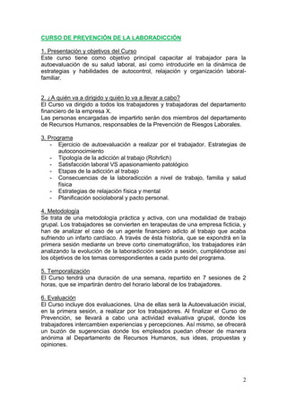 Este documento describe un curso de prevención de la adicción al trabajo impartido por una empresa de servicios en Madrid a su departamento financiero. El curso tuvo una duración de una semana con sesiones de 2 horas y abordó temas como las etapas y consecuencias de la adicción al trabajo, estrategias de relajación y organización laboral. Los resultados del curso mostraron mejoras en la colaboración en equipo, la satisfacción laboral y el clima laboral.