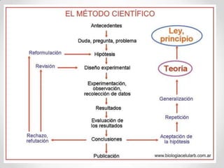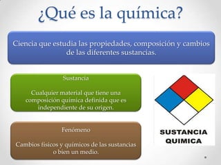 El documento presenta una introducción a la química, describiendo su definición, propiedades y cambios de las sustancias, así como la historia de la química desde la prehistoria hasta la química moderna. Detalla el método científico mediante un ejemplo experimental sobre preferencias de atracción en hombres, resaltando la importancia de replantear hipótesis. Además, se abordan conceptos fundamentales como la materia, sus estados, propiedades físicas y químicas, y cambios de estado.