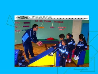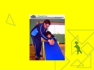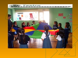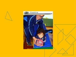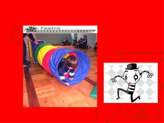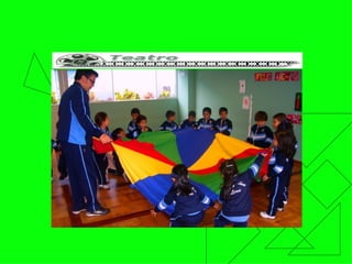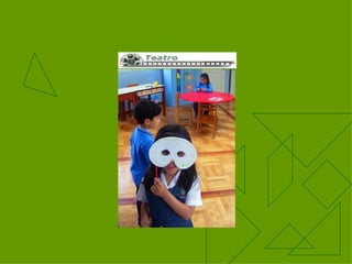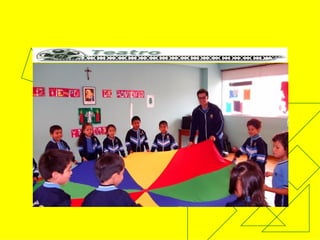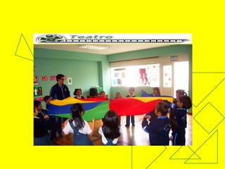El documento presenta un curso de teatro inicial para niños de 4 a 5 años. El taller de teatro utiliza la participación en grupo como forma de aprendizaje y potencia la creatividad, habilidades personales y la interpretación de la realidad. Las características del taller incluyen mejorar la concentración, activar la imaginación y permitir que los niños disfruten de la representación teatral.