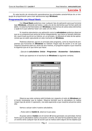 Este documento presenta la primera lección de un curso sobre Visual Basic 6.0. Introduce Visual Basic como un lenguaje de programación para crear aplicaciones de Windows y explica cómo programar usando eventos. También describe los principales componentes del entorno de desarrollo de Visual Basic como el formulario, el cuadro de herramientas, la ventana de propiedades y la barra de herramientas. Finalmente, guía al lector en la creación de su primera aplicación simple en Visual Basic.