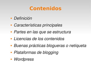 El documento analiza los blogs y su estructura, definiendo sus características principales, partes y buenas prácticas. Se mencionan plataformas de blogging como WordPress y sus variantes, explicando los pros y contras de cada una. Además, se destacan licencias de contenido y la importancia de respetar los derechos de autor en la blogosfera.