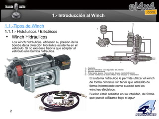 Este documento presenta una introducción básica al funcionamiento y partes de un winch. Explica los tipos de winch eléctricos e hidráulicos, sus ventajas e inconvenientes. También cubre cómo elegir un winch adecuado considerando factores como la capacidad de arrastre, marcas, y requisitos del vehículo. Finalmente, detalla aspectos como el rendimiento del winch y cómo optimizar su uso mediante el enrollado correcto del cable y el uso de poleas.