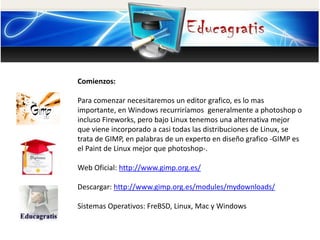 El documento habla sobre el uso de GIMP como una alternativa gratuita a Photoshop para el diseño gráfico en Linux. GIMP viene preinstalado en la mayoría de distribuciones de Linux y es una poderosa herramienta para la edición y creación de imágenes. El sitio educagratis.org ofrece numerosos cursos gratuitos sobre diseño gráfico y otras habilidades artísticas usando herramientas de software libre como GIMP e Inkscape.