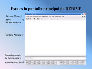 Este documento describe los pasos para factorizar un polinomio en DERIVE, que incluyen: 1) escribir el polinomio en la barra de entrada, 2) hacer clic en "Simplificar" y seleccionar "Factorizar", 3) especificar la variable y forma de factorización, y 4) hacer clic en "Factorizar" para obtener la solución en la ventana central.