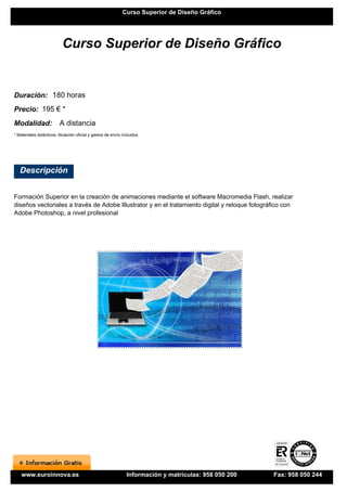 Este curso enseña el uso avanzado de los programas Adobe Photoshop, Illustrator y Macromedia Flash a través de módulos y temas. Dura 180 horas y cuesta 195 euros. Ofrece titulación oficial de la UNESCO y materiales didácticos. Está dirigido a desempleados, estudiantes y profesionales interesados en diseño gráfico.