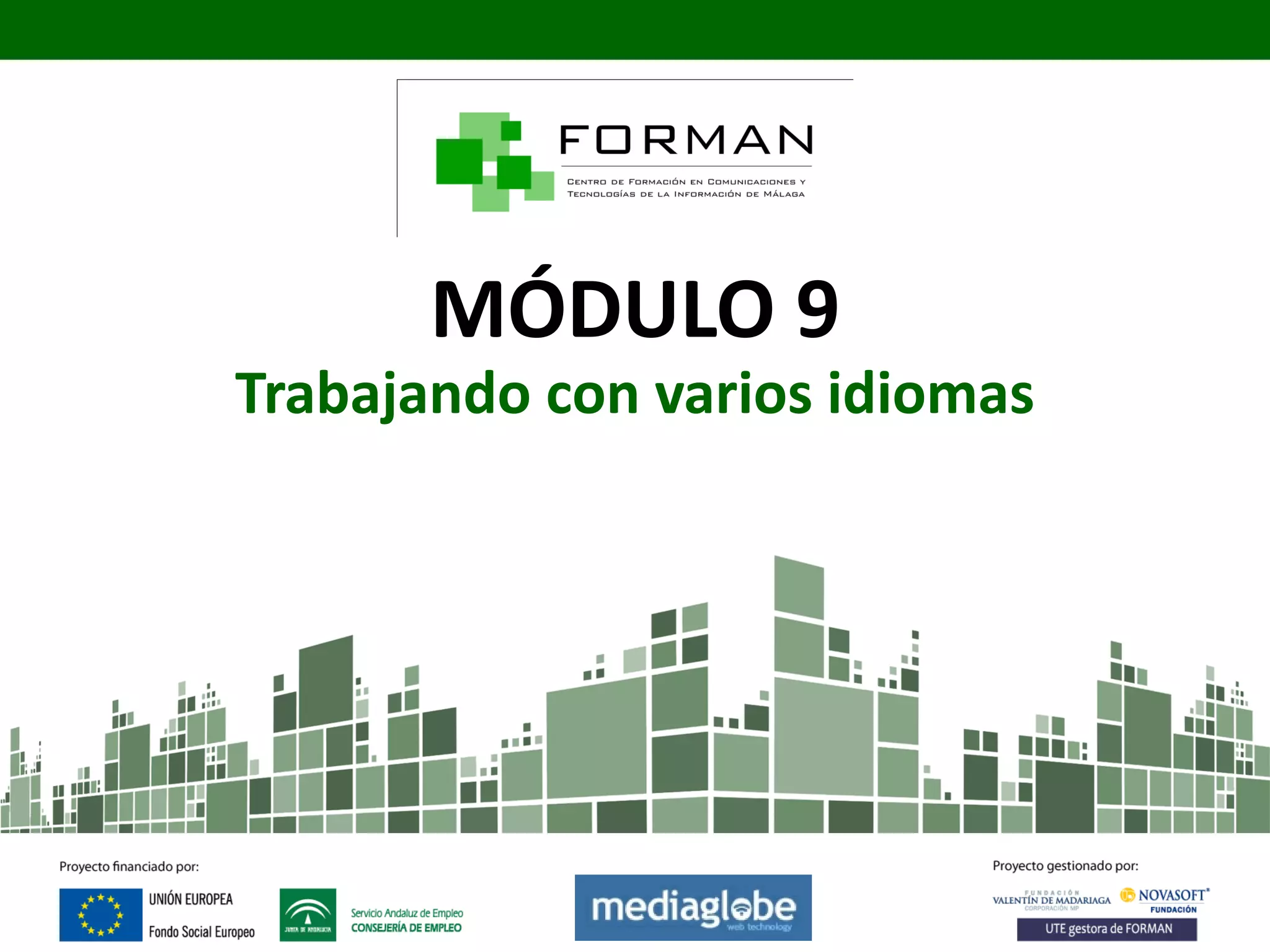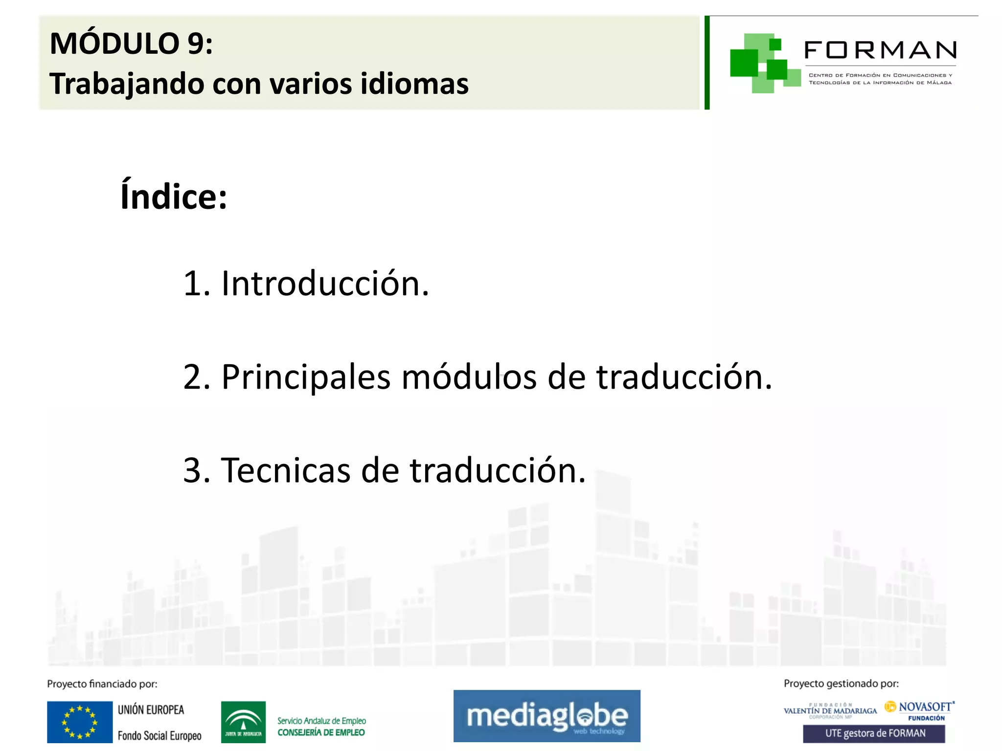 Este módulo explica cómo trabajar con múltiples idiomas en Drupal. Presenta los principales módulos de traducción como Locale y Content Translation que ayudan a traducir la interfaz y el contenido respectivamente. También describe técnicas de traducción como usar archivos PO, herramientas como poEditor y traducir elementos como tipos de datos, menús, taxonomías y variables.
