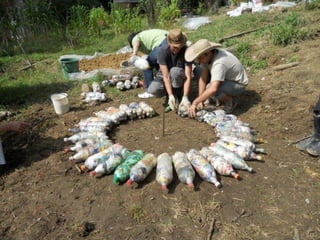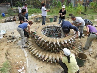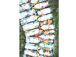 Este documento presenta información sobre la construcción con ecoladrillos, ladrillos hechos de desechos plásticos compactados. Explica cómo hacer ecoladrillos, los impactos ambientales y sociales positivos, y muestra ejemplos de construcciones realizadas con esta técnica en diferentes países, incluyendo casas, tanques de agua, y mobiliario. También proporciona instrucciones detalladas sobre cómo calcular los materiales necesarios y la construcción paso a paso con esta técnica.