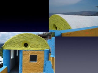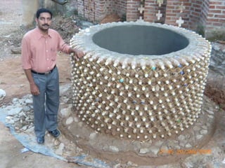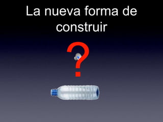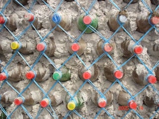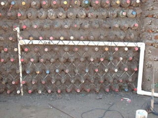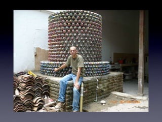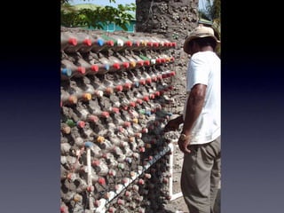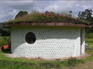 El documento describe los problemas ambientales y sociales causados por los métodos tradicionales de construcción con ladrillos y cemento, así como la contaminación causada por la producción y desecho de botellas de plástico. Luego presenta varias innovaciones ambientales y sociales desarrolladas por EcoTec que utilizan botellas PET recicladas como material de construcción, incluyendo casas, pilares, amarres biomiméticos, tanques de agua y techos. Estas innovaciones ofrecen alternativas más sostenibles a los métodos de construcción tradic