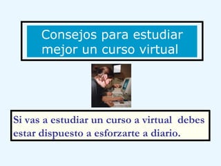 Este documento proporciona consejos para estudiar de manera efectiva un curso virtual. Recomienda crear un ambiente de estudio cómodo y sin distracciones, como usar una silla cómoda y mantener la mesa despejada. Además, sugiere hacer un horario de estudio con períodos de 50 minutos de estudio alternados con 10 minutos de descanso. Finalmente, ofrece consejos sobre cómo leer el material didáctico en forma activa tomando notas, subrayando ideas clave y resumiendo después de cada página.