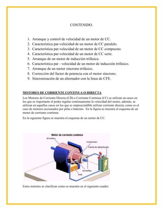 Este documento describe el objetivo y contenido de la operación y manejo de equipo eléctrico en un laboratorio de ingeniería eléctrica. Explica los tipos de motores de corriente continua y alterna, incluyendo sus características y aplicaciones. También describe el equipo de laboratorio utilizado como electrodinamómetros para simular cargas en motores.