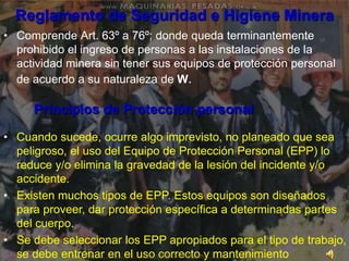 El documento describe los requisitos y principios de seguridad e higiene para el uso de equipos de protección personal (EPP) en la minería. Explica que el uso de EPP adecuados es obligatorio para prevenir accidentes e incluye información sobre los tipos de EPP para proteger la cabeza, los ojos, el sistema respiratorio, los pies y las manos. Además, señala la importancia de seleccionar el EPP correcto para cada tarea y recibir entrenamiento sobre su uso y mantenimiento.