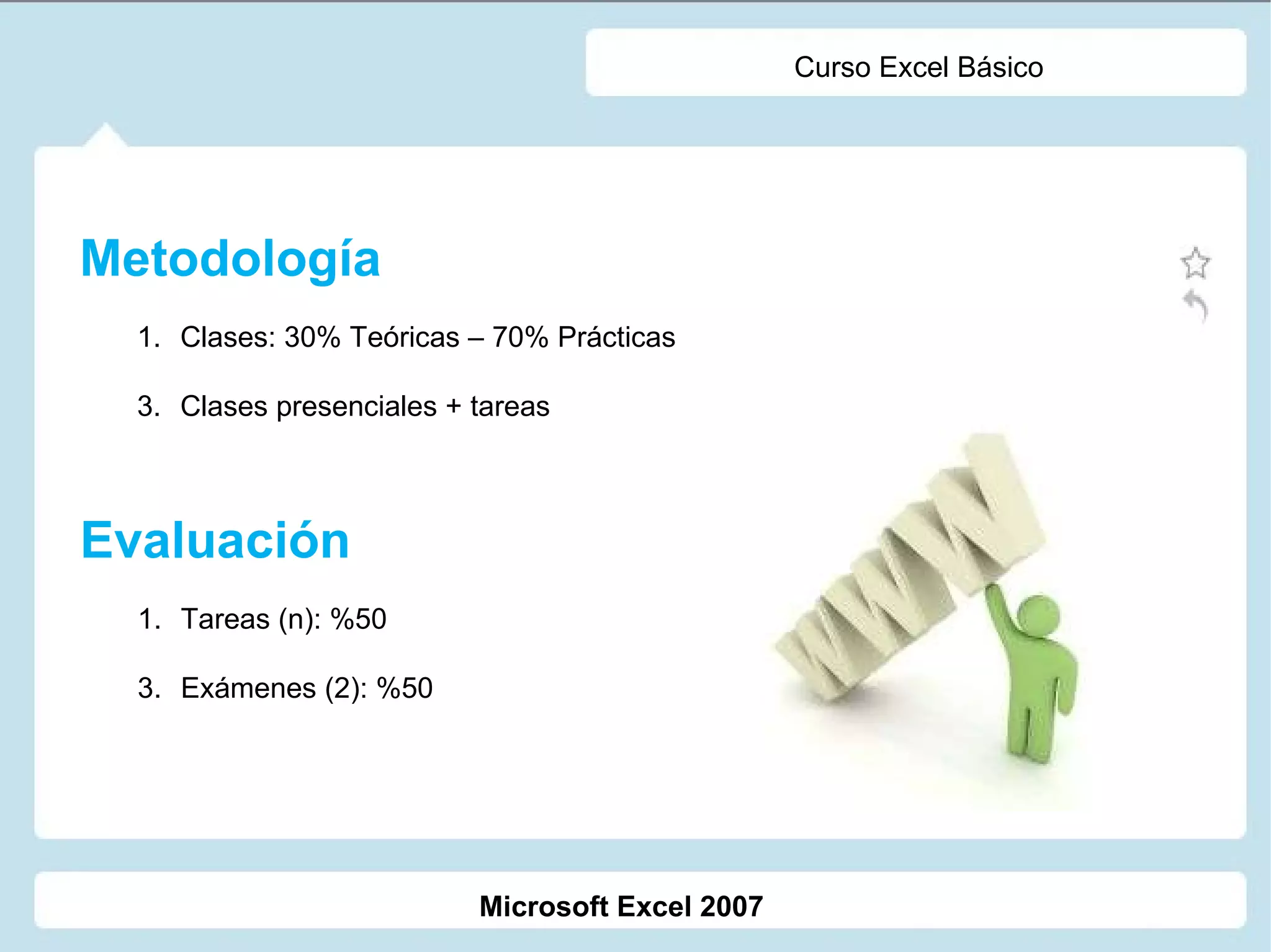 Este documento presenta un resumen del curso básico de Microsoft Excel. Explica que el curso cubrirá temas como formatos, hojas, fórmulas, gráficos y tablas dinámicas a través de clases teóricas y prácticas. También incluye una introducción general a Excel explicando qué es, cómo navegar por una hoja de cálculo e introducir diferentes tipos de datos e información.