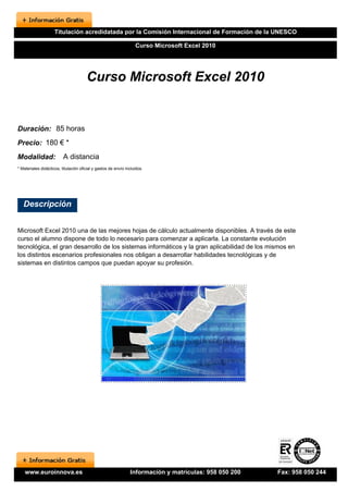 Este documento proporciona información sobre un curso de Microsoft Excel 2010 de 85 horas de duración. El curso enseña a usar las herramientas y funciones de Excel para crear y editar hojas de cálculo de manera eficaz. Los alumnos aprenderán a introducir y dar formato a datos, usar fórmulas y funciones, crear gráficos e imprimir hojas de cálculo. El curso incluye materiales didácticos como un manual, ejercicios y un CD multimedia.